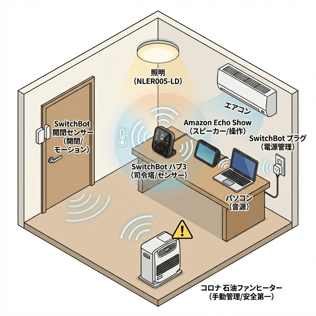 - きっかけ(センサー): SwitchBot 開閉センサー(「入る」「出る」を正確に判定)