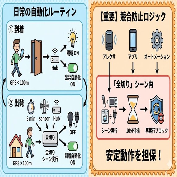 - この厳格な条件により、ゴミ出しなどの一時的な外出での誤作動を防ぎつつ、本当の外出時には100%確実に家電をシャットダウンします。