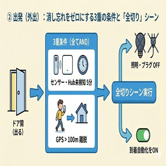 ② 出発(外出):消し忘れをゼロにする3重の条件と「全切り」シーン